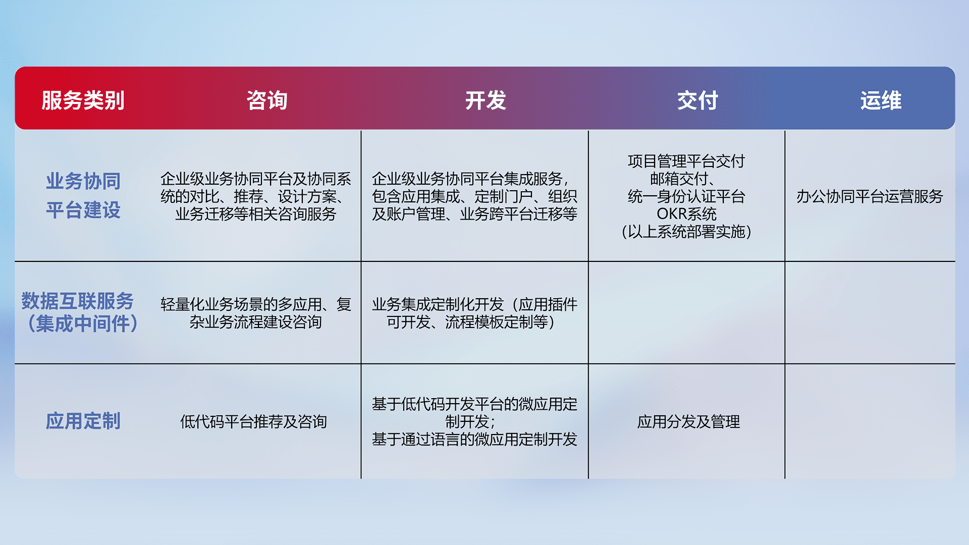 针对钉钉、、、、企微、、、、IDaas等平台级产品提供产品的规划、、、方案、、交付、、、定制化开发等服务,,,实现如统一协同办公、、、、智能客户服务、、混合会议管理、、、智能数据查询、、、等业务场景,,,实现数字化转型。。。